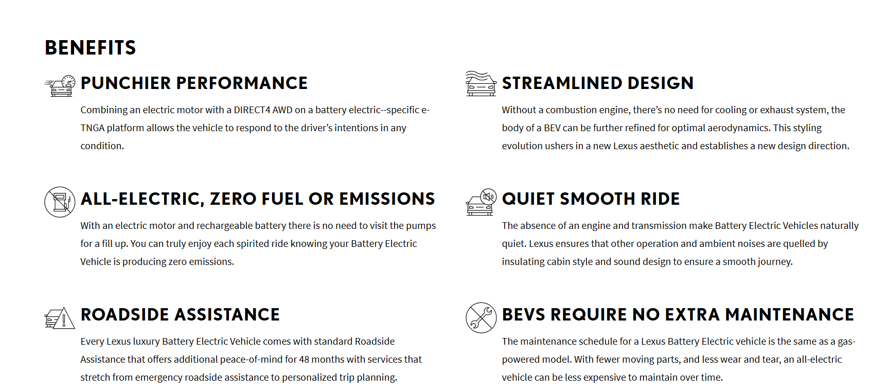 Lexus Battery Electric Vehicles (BEV) deliver a responsive, exhilarating drive powered by an electric motor with zero emissions.